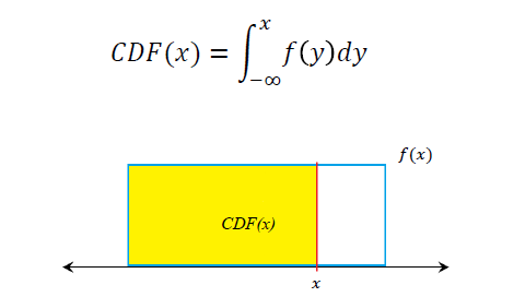 연속균등분포의 누적확률 𝐶𝐷𝐹(𝑥)는 구간 (−∞,𝑥] 에서 𝑓(𝑥) 아래의 면적과 같음
