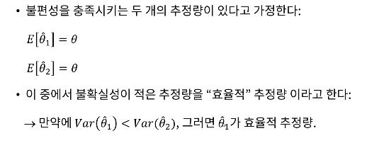 4) 효율성(유효성) : 추정량의 분산이 최솟값이어야 함.