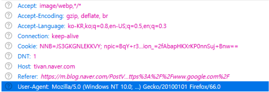 클라이언트(지금 사용중인 컴퓨터)에서 서버에 접속할 때, 요청 헤더라는 정보도 같이 전송
