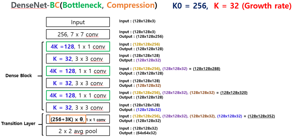 Dense block이 m개의 feature-map을 포함하는 경우, 뒤따르는 transition layer에서 출력 feature-map을 θm개 생성한다.