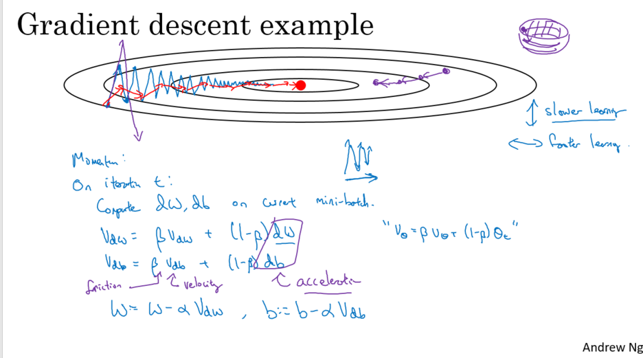 지난 기울기들의 힘(관성)을 받아 방향성 등에 엎고 Local mimimum 탈출한다.