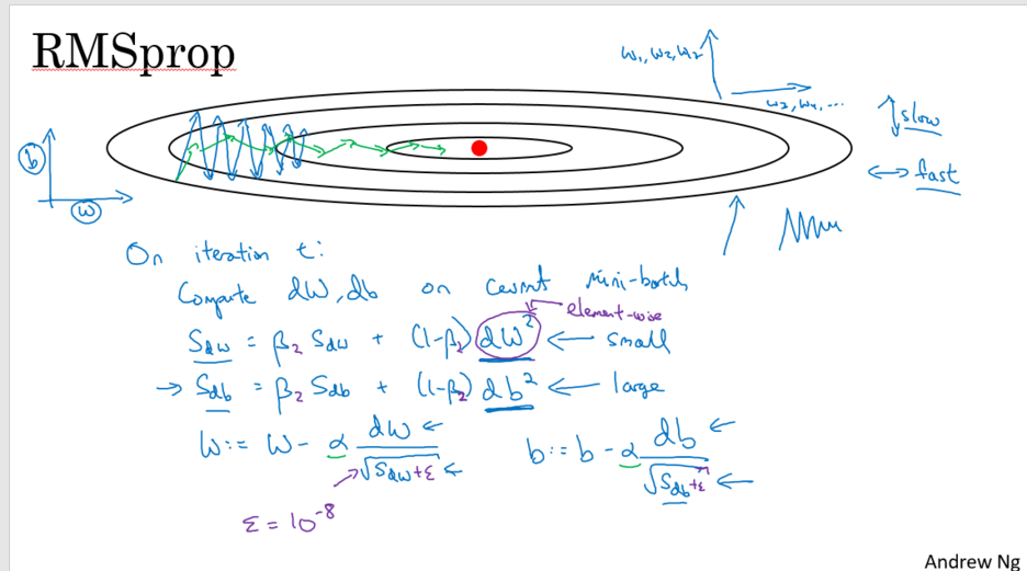 - 앱실론으로 분모 기울기 0으로 가는 단점 막아준다. (학습속도 폭발(오버슛팅) 막아준다.)