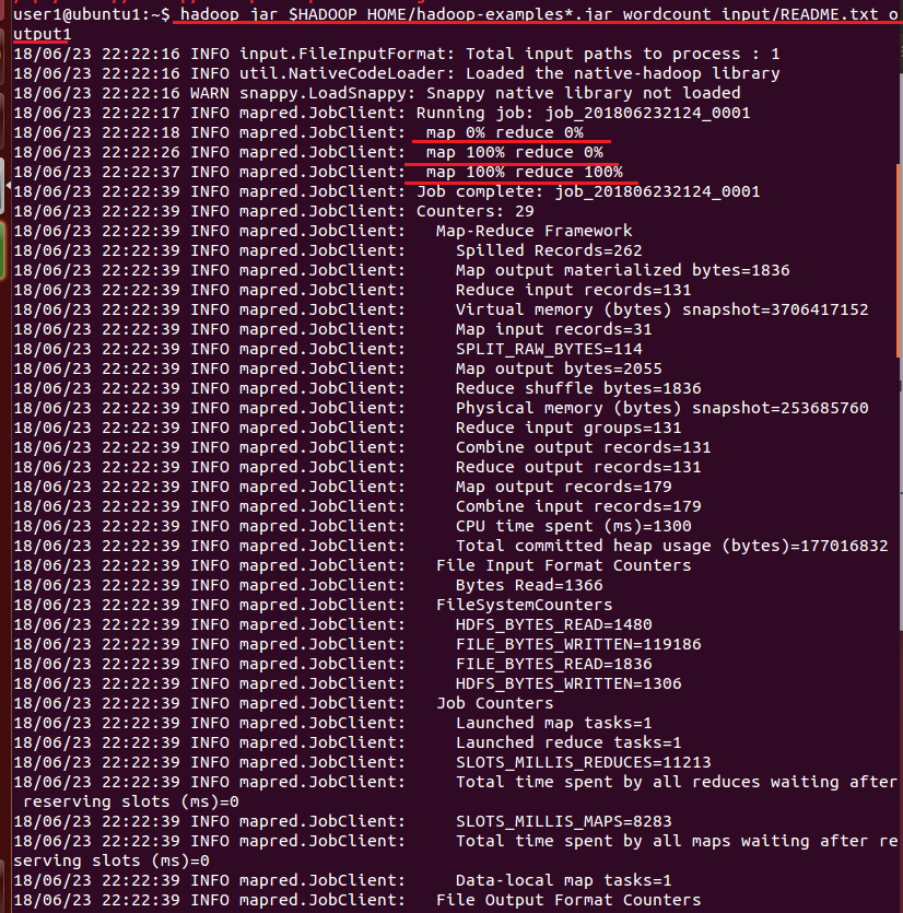 map 100% reduce 100% : mapreduce 작업이 끝났다는 것을 알려준다.