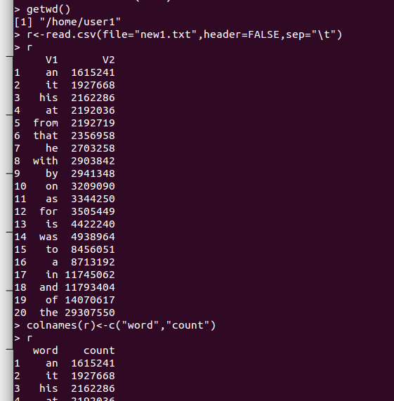 - 운영체제 홈에 있는 wordcount, topN 의 MapReduce를 실행한 결과 new1.txt 파일을 R세상으로 불러옵니다.