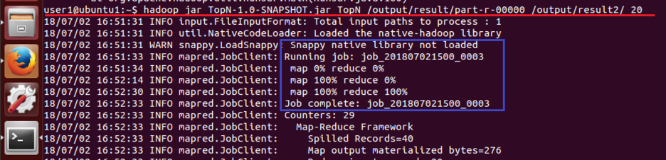 7. hadoop jar TopN-1.0-SNAPSHOT.jar TopN /output/result/part-r-00000 /output/result2/ 20