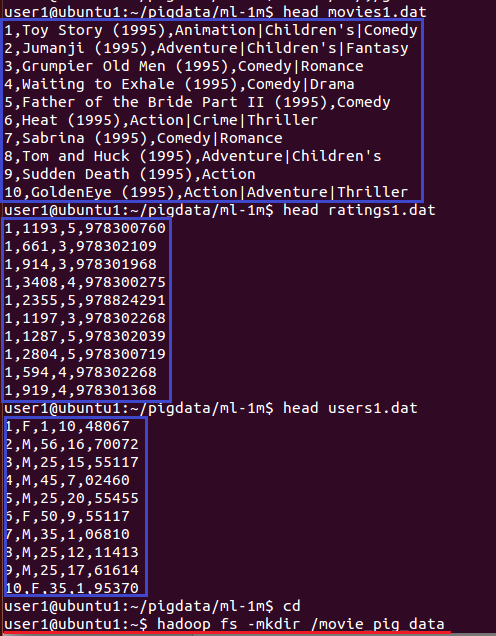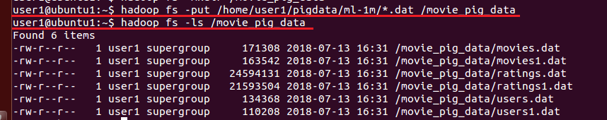11. hadoop fs -put /home/user1/pigdata/ml-1m/*.dat /movie_pig_data