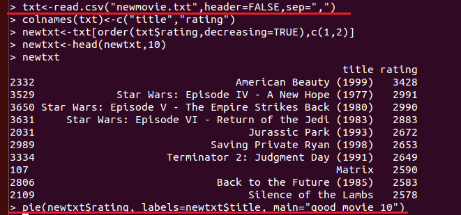 - 운영체제 홈에 있는 Pig에서 MapReduce를 실행한 결과 newmovie.txt 파일을 R세상으로 불러옵니다.
