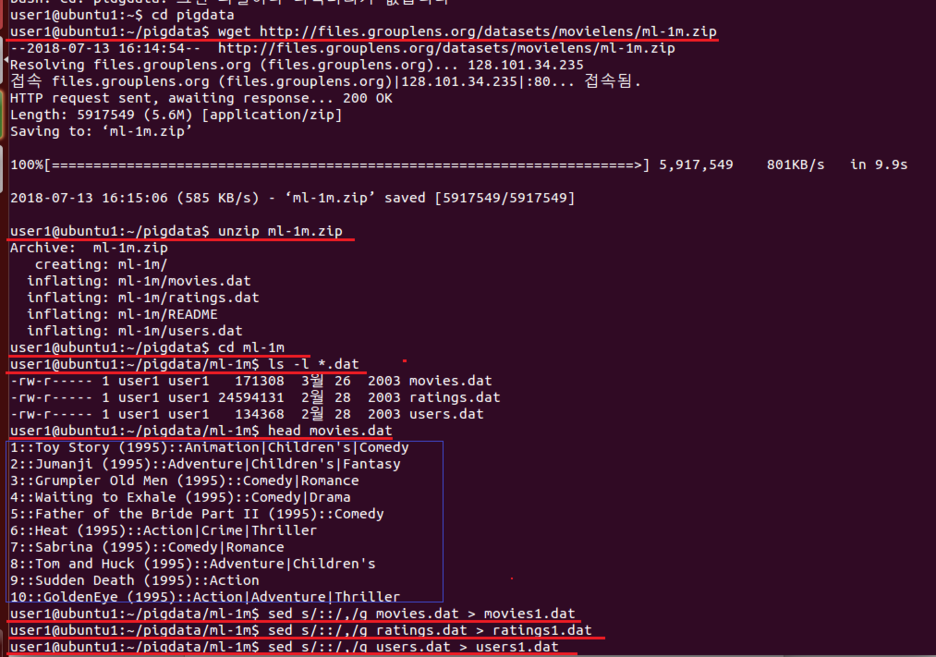 - 운영체제 홈의 pigdata/ml-1m폴더 안의 모든 데이터를 하둡세상 movie_pig_data에 복사한다.