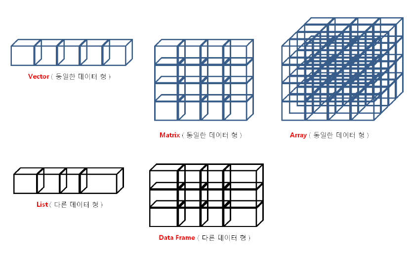 - 숫자만 저장하는 벡터, 문자만 저장하는 배열 존재한다.