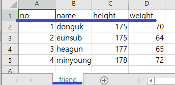 - header=F로 설정하면 제목을 지정하지 않는다. 처음값은 header=T 이다.