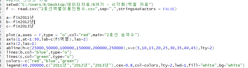 legend(40,200000,c("2011년","2012년","2013년"),cex=0.8,col=colors,lty=2,lwd=1,fill="white",bg="white")
