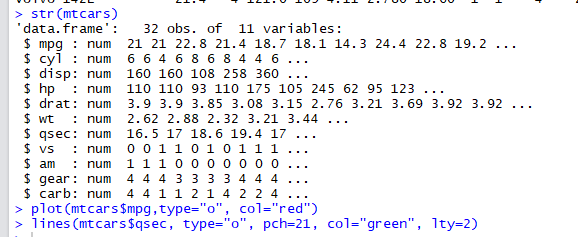 lines(mtcars$qsec, type="o", pch=21, col="green", lty=2)