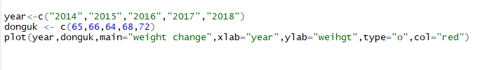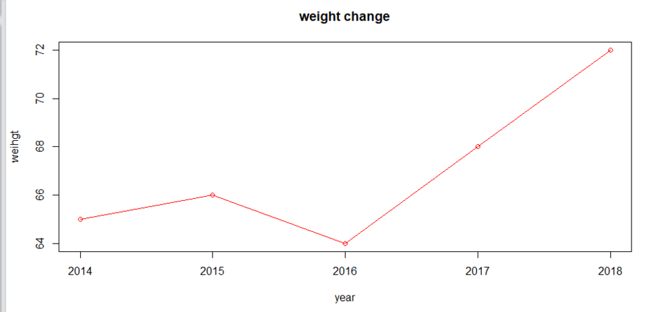 plot(year,donguk,main="weight change",xlab="year",ylab="weihgt",type="o",col="red")