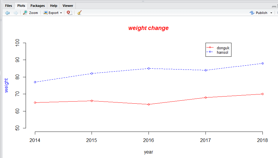 legend(4,100,c("donguk","hansol"),cex=0.8, col=c("red","blue"), pch=21,lty=1:2)