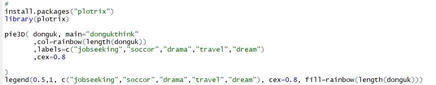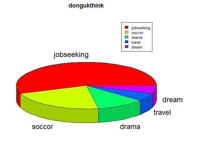 pie3D( donguk, main="dongukthink", col=rainbow(length(donguk)) , labels=c("jobseeking","soccor","drama","travel","dream"), cex=0.8 )
