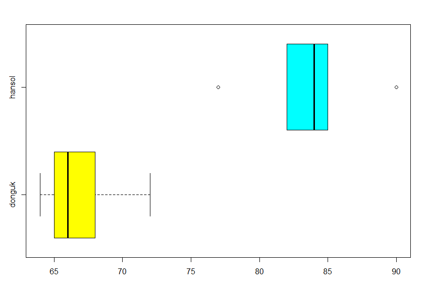 boxplot(donguk, hansol, col=c("yellow", "cyan"), names=c("donguk", "hansol"), horizontal=T)