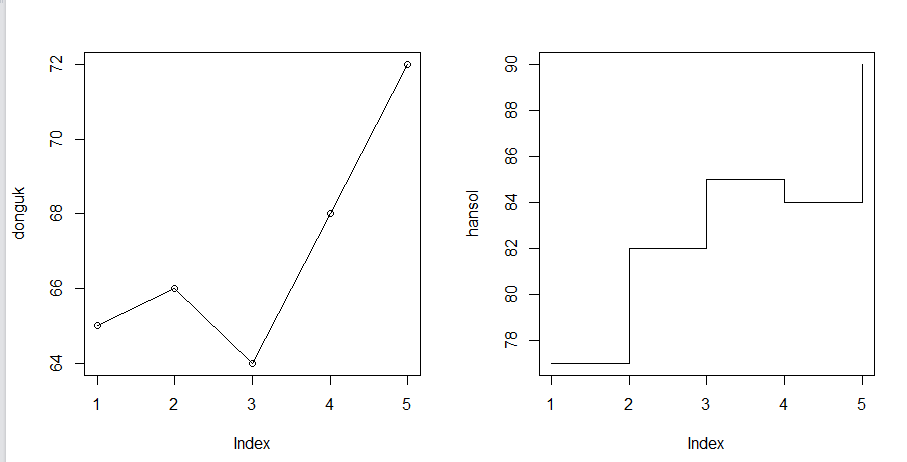 - 두번째 위치에 plot(hansol, type="s") 그래프를 그린다.