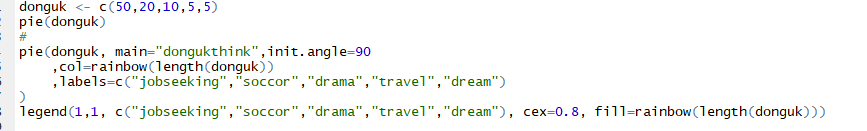 pie(donguk, main="dongukthink", init.angle=90, col=rainbow(length(donguk)) , labels=c("jobseeking","soccor","drama","travel","dream") )