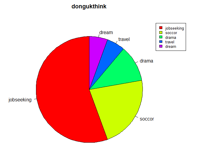 legend(0.5, 1, c("jobseeking","soccor","drama","travel","dream"), cex=0.8, fill=rainbow(length(donguk)))