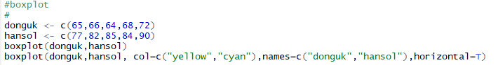 - 두번째 그래프는 boxplot(donguk, hansol, col=c("yellow","cyan"), names=c("donguk","hansol"), horizontal=T)
