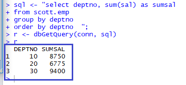 r <- dbGetQuery(conn, "SELECT * FROM scott.emp")
