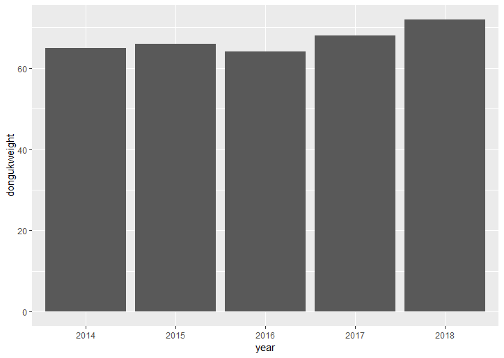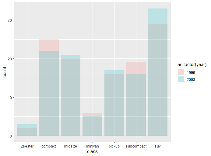 - 미학요소 fill를 통하여 year변수 값에 의하여 막대 색이 달라지게 한다.