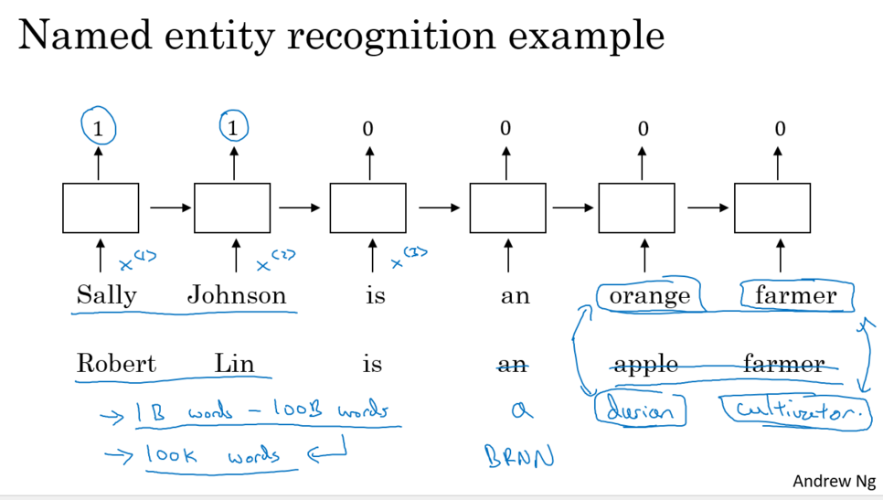 Named entity recognition 문제에서는 BRNN(양방향 RNN)을 사용하면서 학습.
