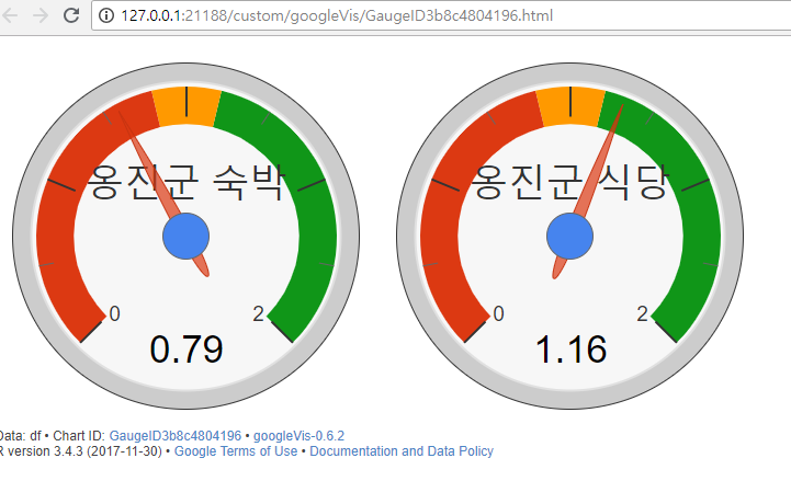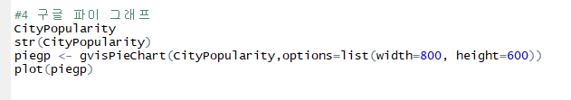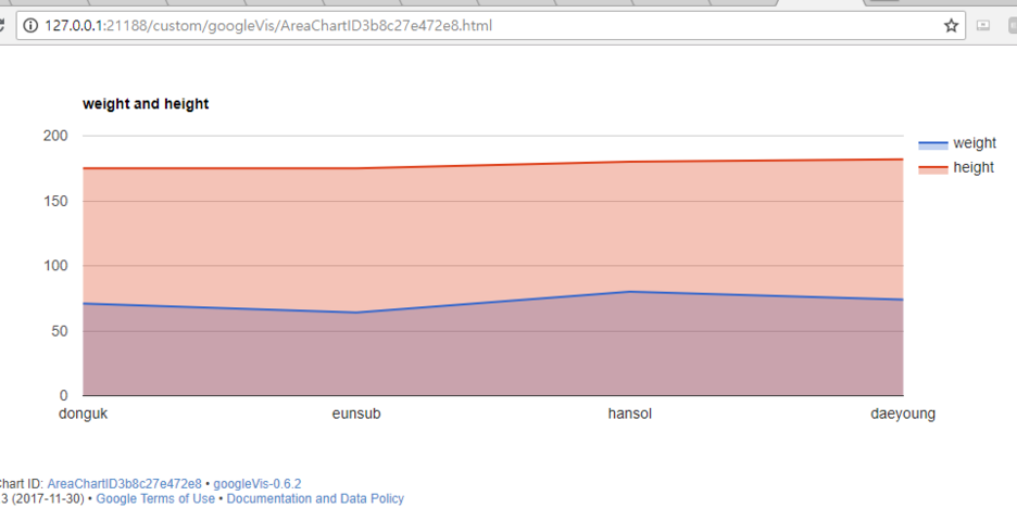 - gvisColumnchart() gvisAreaChart() 함수의 결과는 HTML로 작성된다. 그래서 변수로 저장하고 다른 그래 프함수(plot())로 부른다.