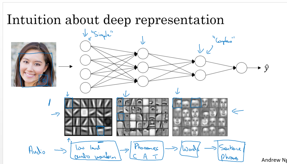 높은 층(출력에 가깝다) : 더 높은 수준. 여러 가지 특징들 추출하여 조합하면서 올라간다. 복잡한 함수.