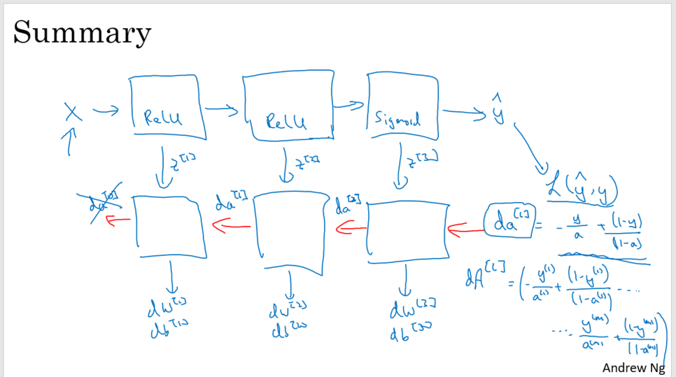 각 layer에서 dz가 재귀함수마냥 그 전 층, 전전 층의 기울기를 (마지막은 출력층) 계속 이어받는다.