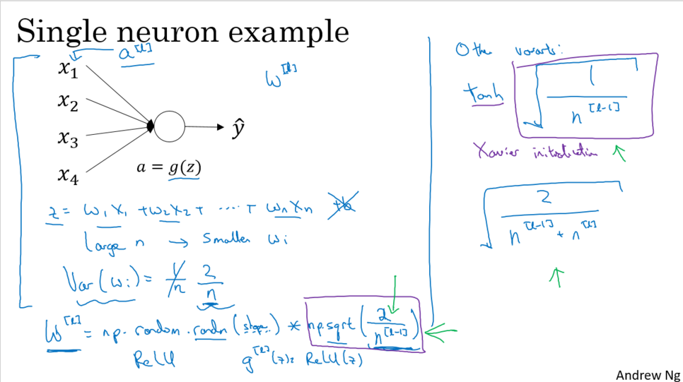 만약 입력 activation의 입력 특성이 대략적으로 평균 0 와 편차 1이면 이것은 z가 비슷한 scale을 갖게 할 것이고 문제해결이 되지 않을 것입니다. 하지만 확실히 vanishing과 exploding gradient 문제를 도와주기는 합니다. 왜냐면 w하는 비중 매트릭스를 세팅해서 1보다 너무 크지 않고, 1보다 너무 작지 않게 해서 너무 빨리 explode하거나 vanish하지 않게 하려는 것입니다
