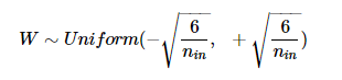 이 방법은 균등 분포(Uniform Distribution) 또는 정규 분포(Normal distribution)로 초기화 할 때 두 가지 경우로 나눈다. 다만, He 초기화는 세이비어 초기화와 다르게 다음 층의 뉴런의 수를 반영하지 않음. 전과 같이 이전 층의 뉴런의 개수를 nin만 있음.