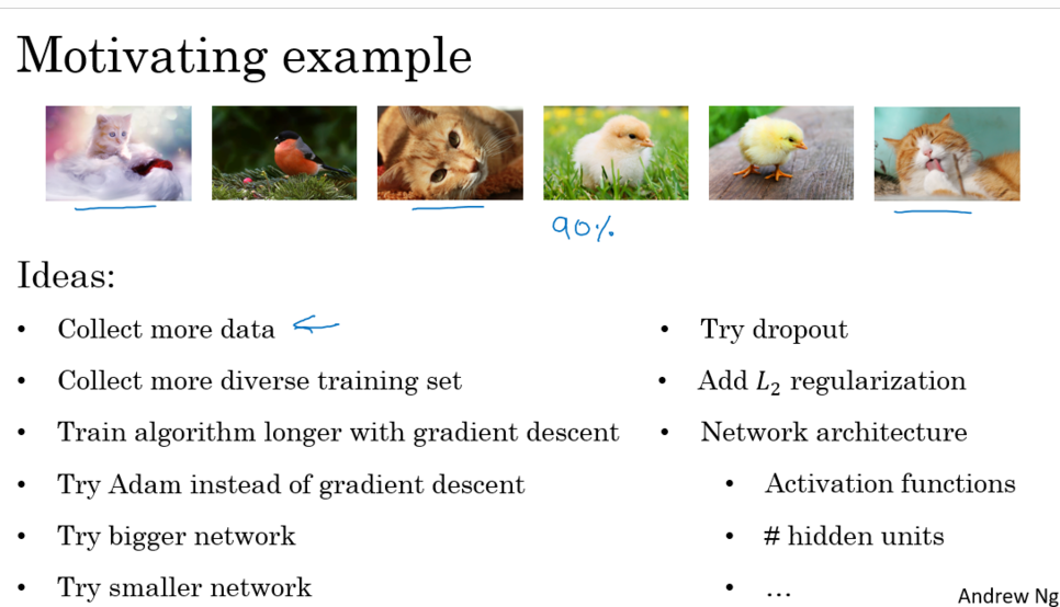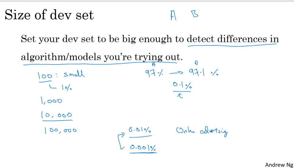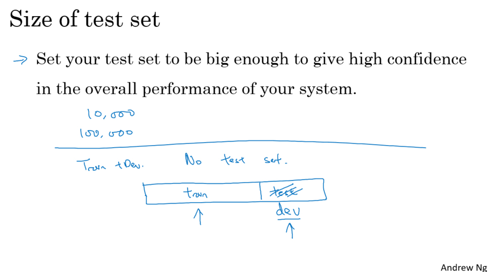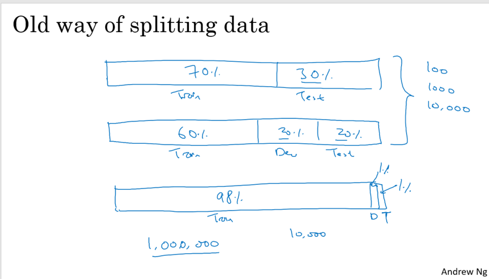 - 많은 데이터 셋을 가지는 경우 : 98% 트레이닝 세트, 1% dev, 1% 테스트로 분배가 합리적.