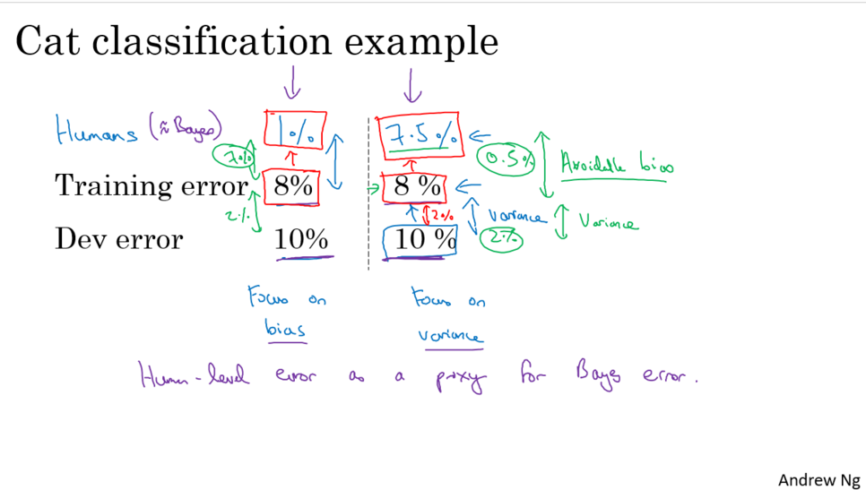해당 예시에서는 avoidable bias가 0.5퍼센트이거나, 2퍼센트는 편차 수치