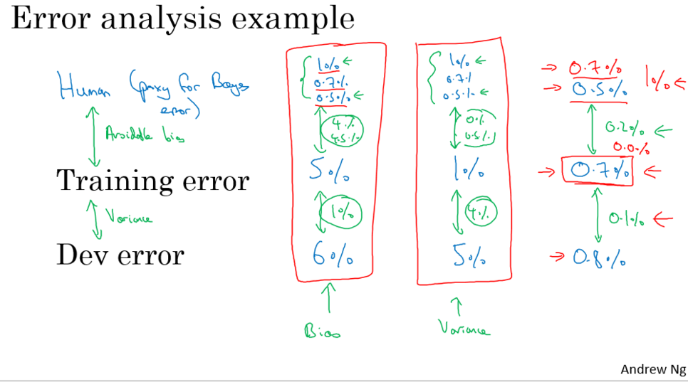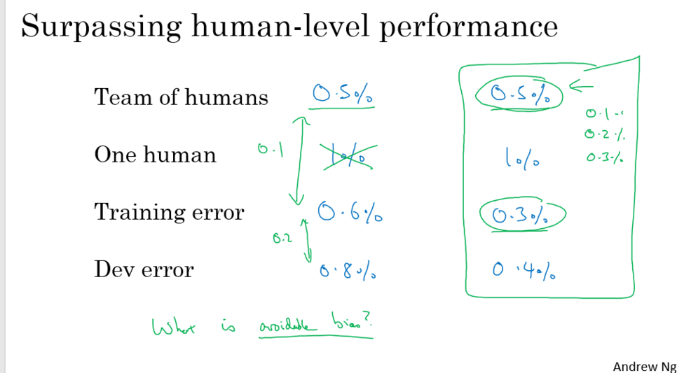 0.7% 오류에 도달했을 때, Bayes error를 추정하는데 신경 쓰지 않는 이상, Bayes error에서 얼마나 떨어져 있는지 알기 어렵. (의사팀인 0.5%를 기반으로 Bayes error를 추정해야 avoidable bias 측정 가능)